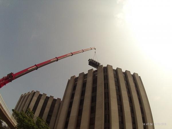 These pictures just show the preparation for the lifts. The scope was to replace chillers at this location and the challenge was to finding the right size crane to fit the confined location, the safe working load that needed to be achieved and a very low the point loading.